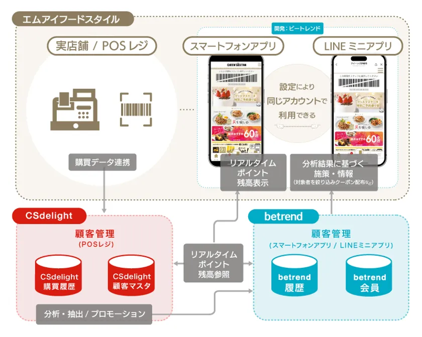 LINEミニアプリ『クイーンズ伊勢丹』は、ビートレンド株式会社と東芝テック株式会社(本社:東京都品川区、代表取締役社長:錦織 弘信)が共同で提供する、量販店向け顧客管理サービス『betrend CSdelight連携プラン』を導入しています。アプリ会員証を中心としたポイント管理や、購買データを活用した顧客分析とプロモーション施策を実現しています。また、『betrend CSdelight連携プラン』は以前から提供しているスマートフォンアプリ『クイーンズ伊勢丹公式アプリ』でも導入しており、LINEミニアプリ版とスマートフォンアプリ版を同じアカウントで利用することができます。