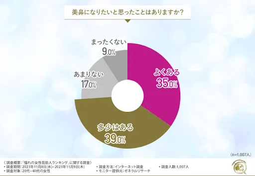 「美鼻になりたいと思ったことはありますか?」と質問したところ、『よくある(35.0%)』『多少はある(39.0%)』『あまりない(17.0%)』『まったくない(9.0%)』という回答結果になりました。