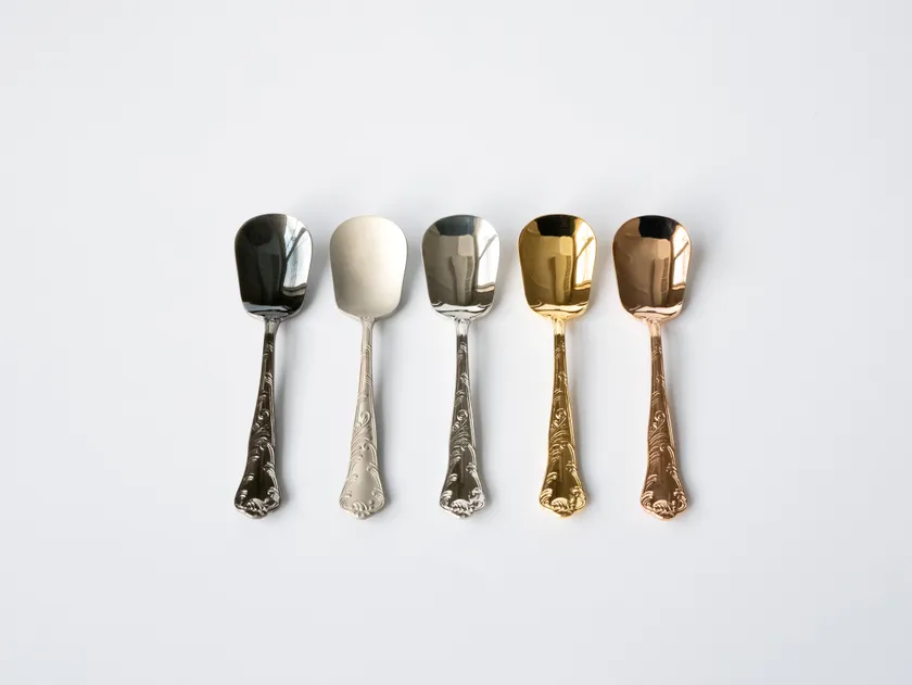 昔ながらのラグジュアリーな装飾が美しいアイスクリームカップは、メッキやコーティングを使用せず光の力のみで彩られ、美しく輝きます。アイスクリームスプーンはGoldは24Kの金メッキを、Roseはピンクゴールドメッキを使用し、ゴージャスな仕上がりになっております。