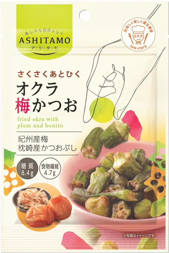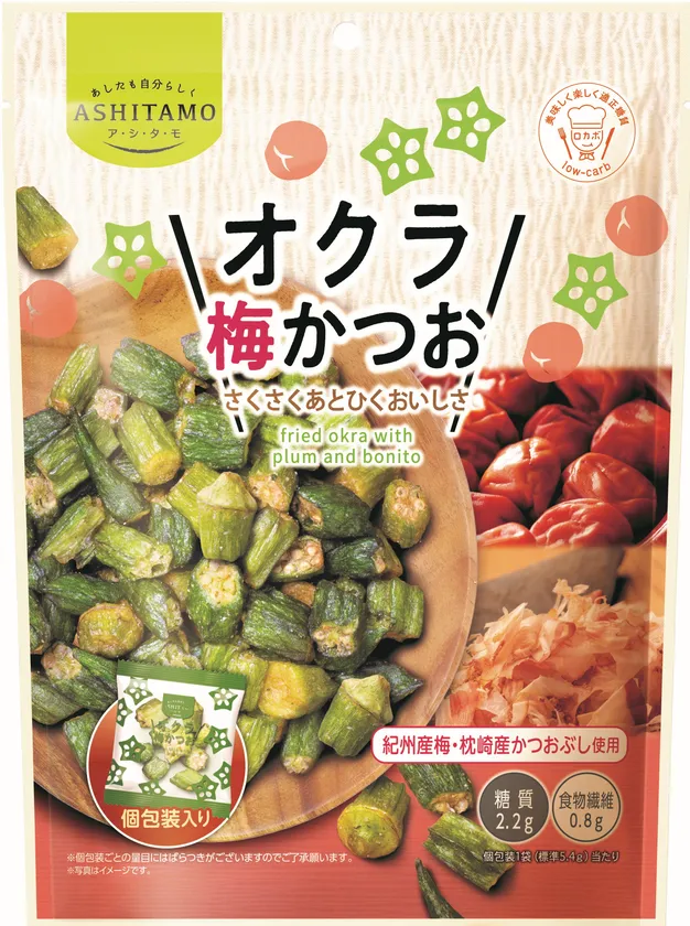 さくさくあとひく!女性にうれしいロカボな“オクラのスナック” 「ASHITAMO 大袋 オクラ梅かつお」を 11月27日(月)リニューアル発売!