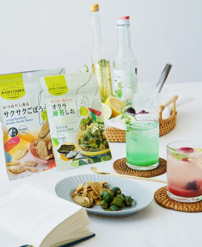 近年、健康志向によって、野菜・豆・果物などを素揚げした素材系スナックが伸長してきました。当社で販売中の「ASHITAMO」シリーズ人気No.1(※1)「小袋 オクラ梅かつお(20g)」も多くの女性のお客様からご好評いただき、「美味しいのに罪悪感がない」「おやつにもお酒のおつまみにも食べられる」「夫と子供も大好き」などのお声をいただいております。