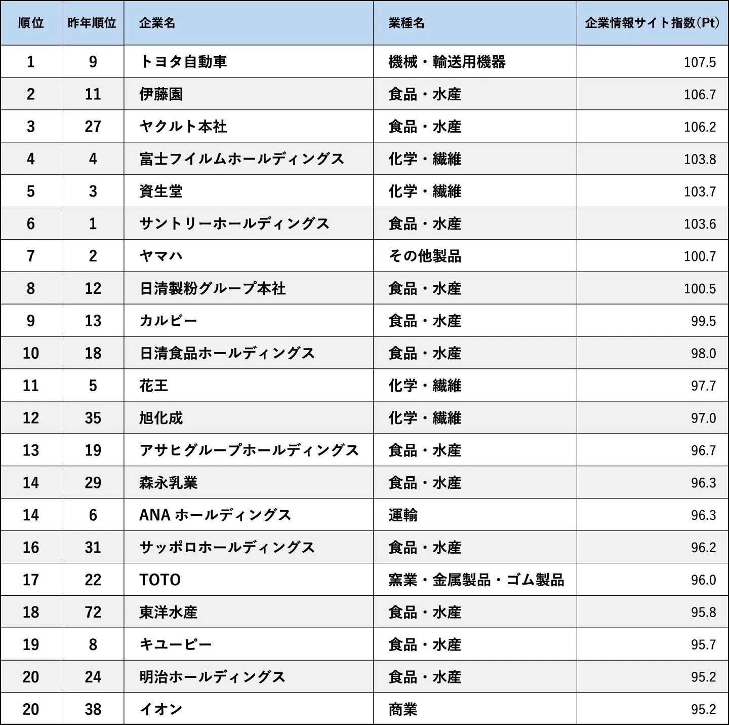 ・トヨタ自動車がトップ。2位は伊藤園、3位はヤクルト本社