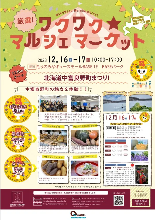 北海道中富良野町の企画課(主幹:対馬 靖士)、なかふらの観光協会理事(四季の宿KI・ZU・NA:中島 博史、遠藤ファーム:遠藤 康仁)、地域活性化起業人(H.I.S:酒井 広志)、地域おこし協力隊(中田 元貴、大水 聡子)ら6名は、町のブランディング事業の一環として、大阪もりのみやキューズモールBASEにて、2023年12月16日~17日の2日間、観光や移住に関する物販イベントを行います。