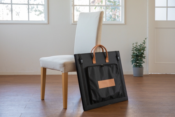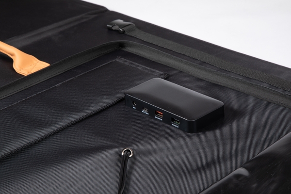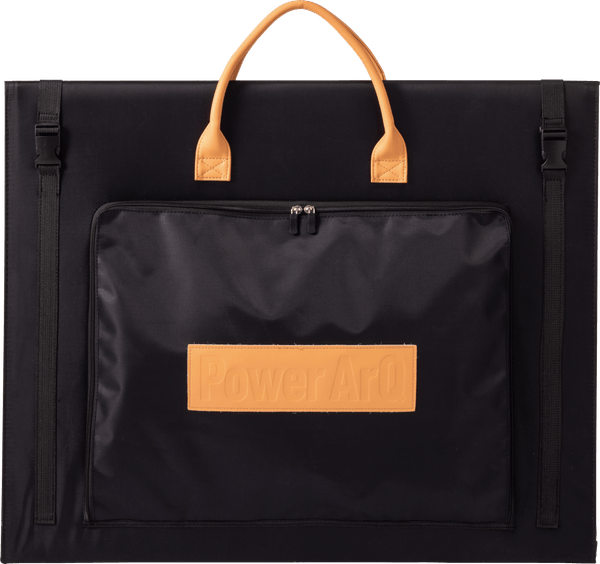 ポータブル電源PowerArQに、付属のケーブルを繋ぐだけで即使用可能。3枚のパネルで構成された折りたたみ式で、たたんだときのサイズは、68.6×55.2×2.2cm。上部には革製の取っ手があるので持ち運びやすく、薄さ2.2cmなので、場所を取らないコンパクトな保管が可能。