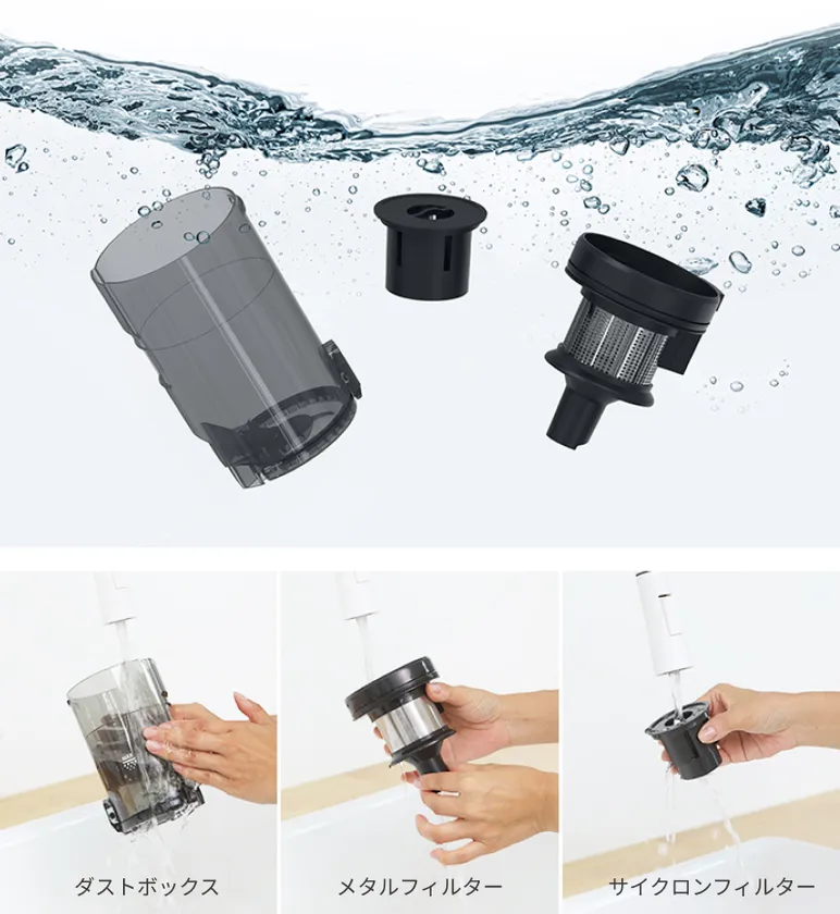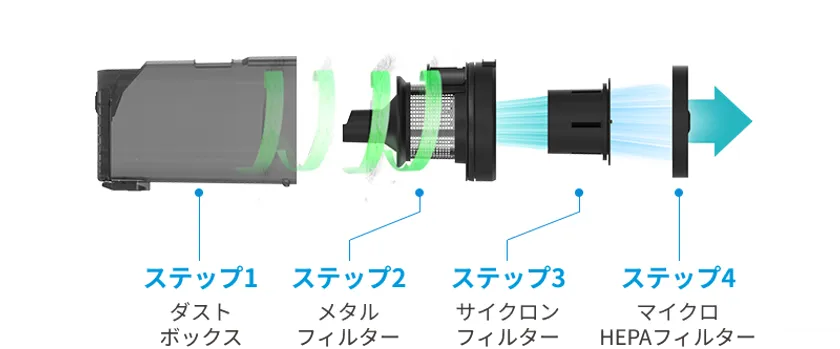 この製品は、空気清浄機にも使用される高品質のHEPAフィルターを搭載しており、極めて細かい粉塵の除去に優れています。ダストボックスは大容量で洗浄可能、フィルターも水洗いできるため、清潔さを保ちながら簡単なメンテナンスが可能です。さらに、購入時には追加で2個のHEPAフィルターが提供され、長期間にわたってご使用いただけます。