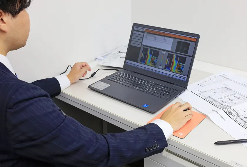 「外壁タイル浮き検出AIシステム」による解析中の様子