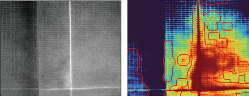 左:ドローンで撮影した赤外線画像 右:AIにより解析された画像