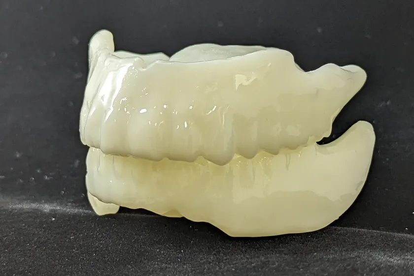 当社では2021年より3Dプリンターで作る全く同じ形の予備入れ歯の製作を開始しました。利用者の多くは就寝時に使用していましたが、無意識に歯を食いしばり翌朝あごが怠いという声もありました。寝る時専用であれば食事をしないので柔らかくて良いのではと考え、開発中だったマリンスポーツ用の入れ歯型マウスピースの技術を応用して試作を開始しました。モニター8名の協力のもと、0.5ミリ単位で厚みを調整しながら約50回の試作を繰り返し完成しました。使用中の入れ歯と全く同じ形に仕上がるので違和感がなく、通常1週間程度、早くて2~3日で完成します。