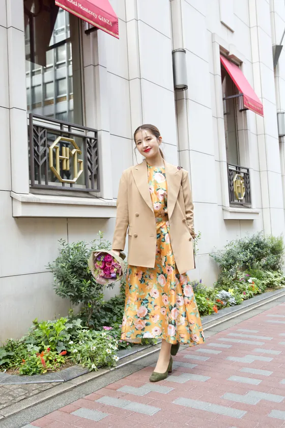 マリーゴールドカラーに大きな花柄が多幸感あふれるビッグシルエットワンピース。