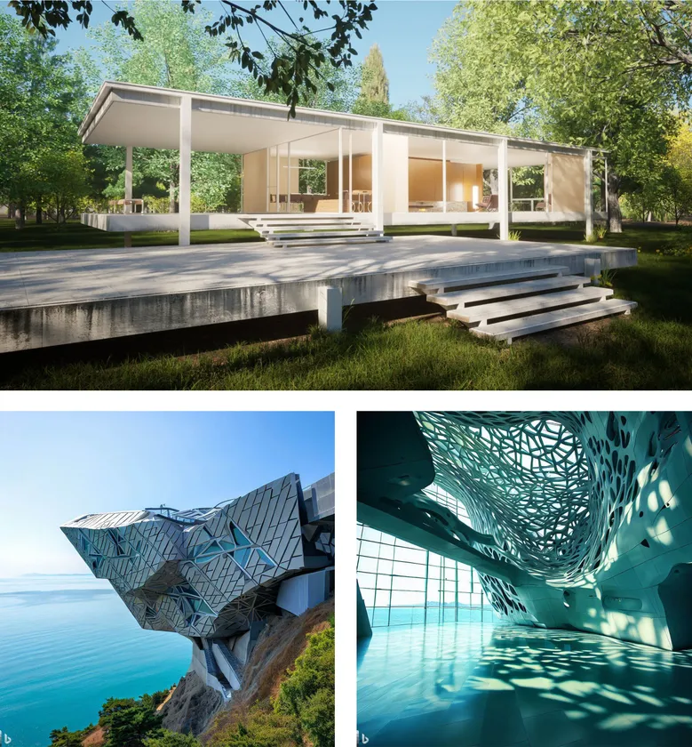 上:Fortniteで制作したFarnsworth House/左下:AIで制作した外観パース/右下:AIで制作した内観パース