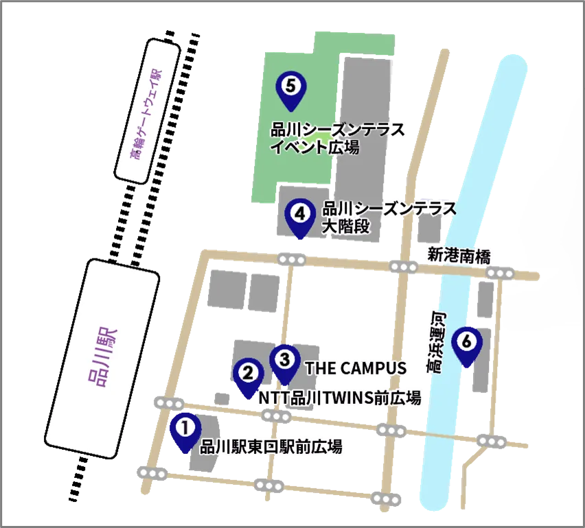 品川港南エリアは、品川を拠点とする企業に通勤するワーカーが集まるほか、湾岸エリアにはタワーマンションが並び、将来的にも若い世代の増加が見込まれるなど、ワーカー、住民そして来街者が混在する多様なコミュニティをもつエリアとなっています。また、高浜運河の水辺空間や品川シーズンテラスをはじめとした緑地など、豊かな自然環境も有しています。本取り組みでは、こうした品川港南エリアの魅力となる水辺や緑地などのスポットを中心に、全6か所にXRコンテンツを配置することで、品川港南エリアに住み、働き、訪れるみなさまに対し、品川港南の魅力再発見につながる回遊や滞在を促します。