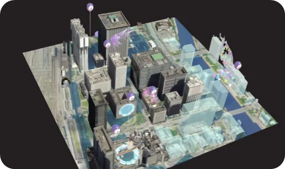 品川シーズンテラスの店舗等で配布されるカードを本アプリでかざすと目の前に品川港南の街が現れ、本イベントに登場する全てのXRコンテンツを3Dマップ上に見ることができます。
