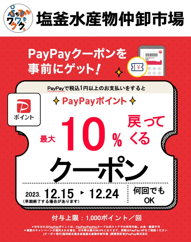 令和5年12月15日(金)~12月24日(日)の期間中、PayPay決済対応店舗で1円以上の決済をすると、決済金額の最大10%のポイントを付与します