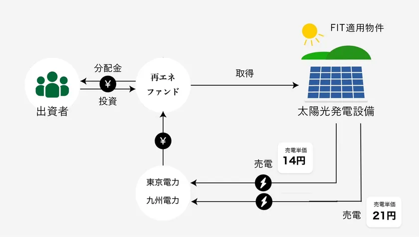 太陽光発電所で発電した電気を、固定価格買取制度に基づく売電単価で電力会社に売電を行い、収入を得て出資者に利益を分配します。