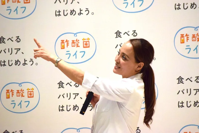 (左)免疫機能を向上する新たな選択肢として酢酸菌の最新研究結果を紹介する、石原新菜 先生 (右)酢酸菌入りの「にごり酢」