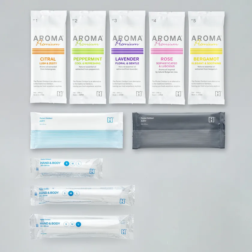 新商品は、体や顔を含む肌全体にご使用いただける(※2) 業界初のおしぼりとして、香りおしぼり国内シェアNO.1(※3)を誇る『AROMA Premium』、身体を拭くために生まれたおしぼり『HAND&BODY』、拭き心地と環境への優しさを追求したスタンダードな定番品『AIRY』の3製品を刷新し、2023年11月29日(水)に販売を開始いたします。