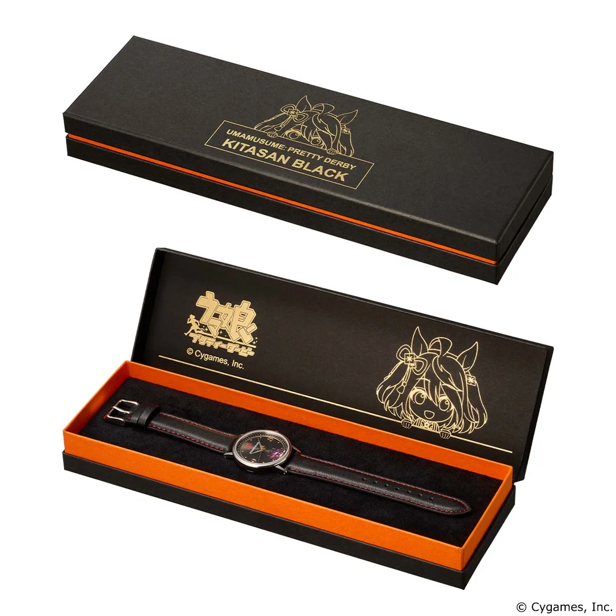 キタサンブラックをイメージした、ブラックの腕時計。バンドのステッチや文字盤上部のシューズのオレンジが、ブラックのカラーに華やかな彩りを添えます。秒針には、耳飾りのリボンのモチーフがあしらわれています。