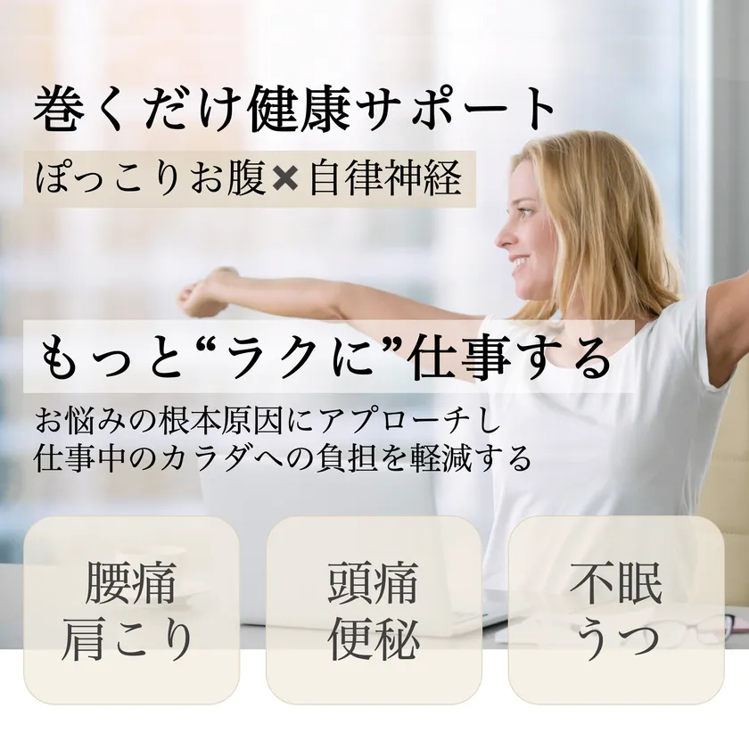 奈良県立大学 MBT研究所 副所長 梅田智広教授との共同研究により、姿勢矯正ベルトによる筋骨格系への刺激が1.5倍、動作改善が30%向上し、自律神経の改善についての科学的根拠が示されました。これにより頭痛、肩こり、腰痛、不眠、生理痛、うつ、自律神経の乱れなどの不調を軽減・予防し、健康診断だけでは見過ごされがちな健康課題へのアプローチが可能です。