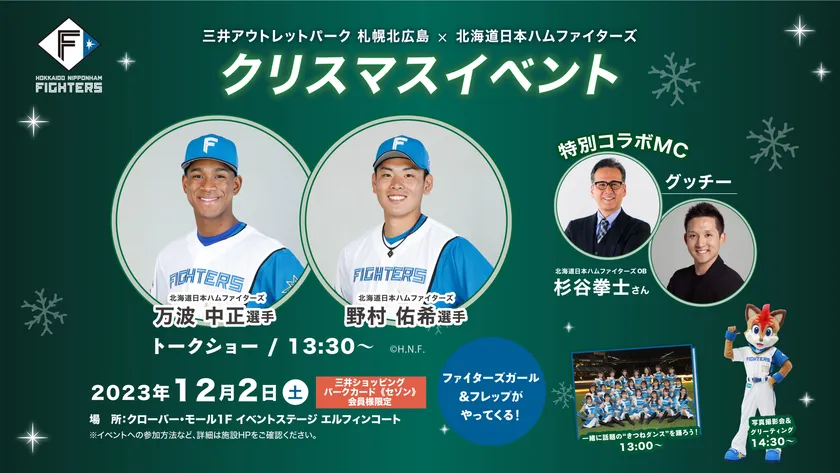 北海道日本ハムファイターズの万波中正選手と、野村佑希選手がスペシャルゲスト!MCには北海道日本ハムファイターズOBの杉谷拳士さんとグッチーさんの特別コラボが実現。シーズンの振り返りや、記憶に残るシーンなどここでしか聞けない豪華4人のスペシャルトークショーイベントをおこないます。参加者のみなさまと選手が一緒に楽しんでいただきたいという想いから、トークショーの他に「夢を叶えよう企画」や景品が当たるミニゲーム、抽選会などもおこないます。またファイターズガールとフレップによるダンスパフォーマンスで会場を盛り上げます。