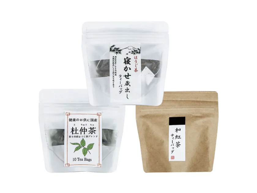 お茶専業農協がお届けする、富士のほうじ茶とブレンドした杜仲茶、香味豊かで清涼感のある高級品種「香駿」のほうじ茶、富士山の麓で育てられた芳醇な香りの和紅茶、3種のティーパック飲み比べセットです。(Aコース)