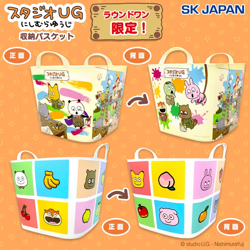 雑貨アイテムは、仲間たちがお絵描きを楽しむ姿が可愛い「お絵描き柄」と「フルーツ柄」をテーマにしたデザインで、日常使いにぴったりな収納バスケットとバッグになりました!