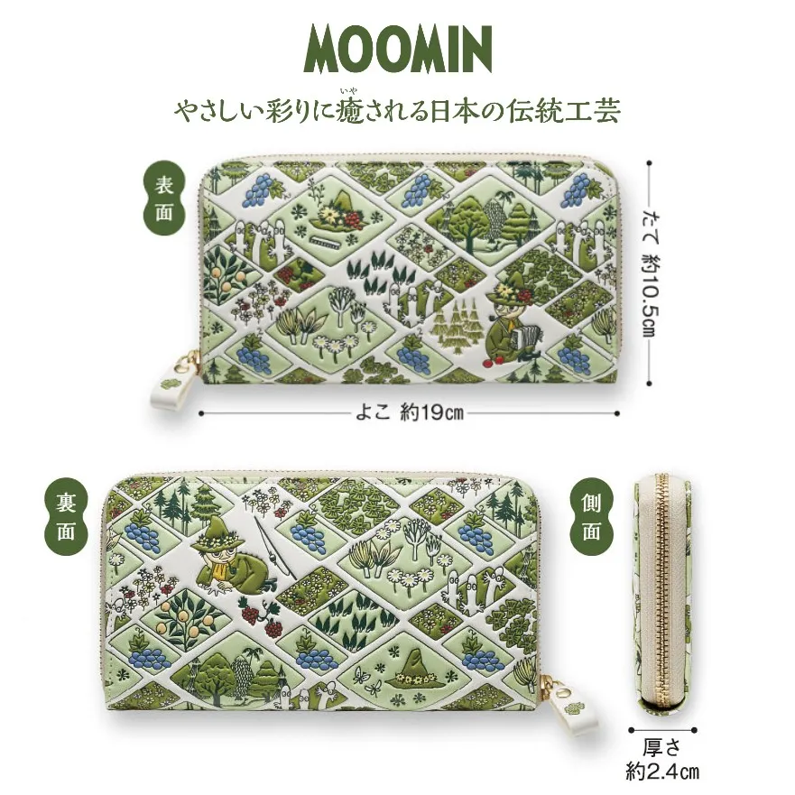 <スナフキン くつろぎの森>浅草文庫 牛革製長財布、新登場! 表面と裏面で違うスナフキンの姿や、立体感が楽しいレザーウォレットです