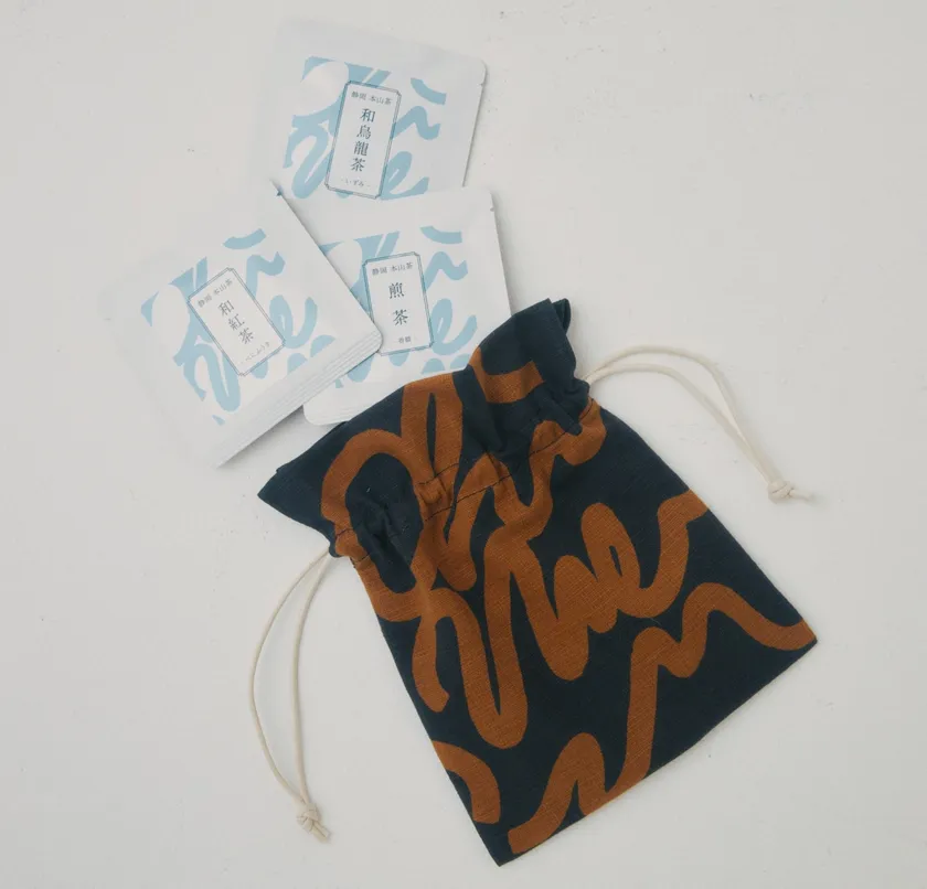 室町時代に織物とならんで発達した染色業をルーツとする駿河和染。様々な染技法や染料があり、着色部と白のコントラストがはっきりした力強さが特長です。本コラボレーションでは、静岡ならではの天然染料を使ったお茶染めに、製造工程で出る商品にならない茶葉を使い環境にも配慮した技法を考案したお茶染めWashizu.(鷲巣染物店の5代目)と、170年こだわりのお茶を作り続けてきた茶屋すずわ(静岡のお茶問屋)、そしてクリエイターのHal Shibata氏がコラボ。Hal Shibata氏が静岡の代名詞でもある、駿河湾や富士山から考案した新しい駿河和染のデザインで、お茶染めWashizu.が茶染・型染による茶巾袋を制作し、茶屋すずわがブレンドした煎茶、和紅茶、和烏龍茶を詰めたお茶パックを販売します。