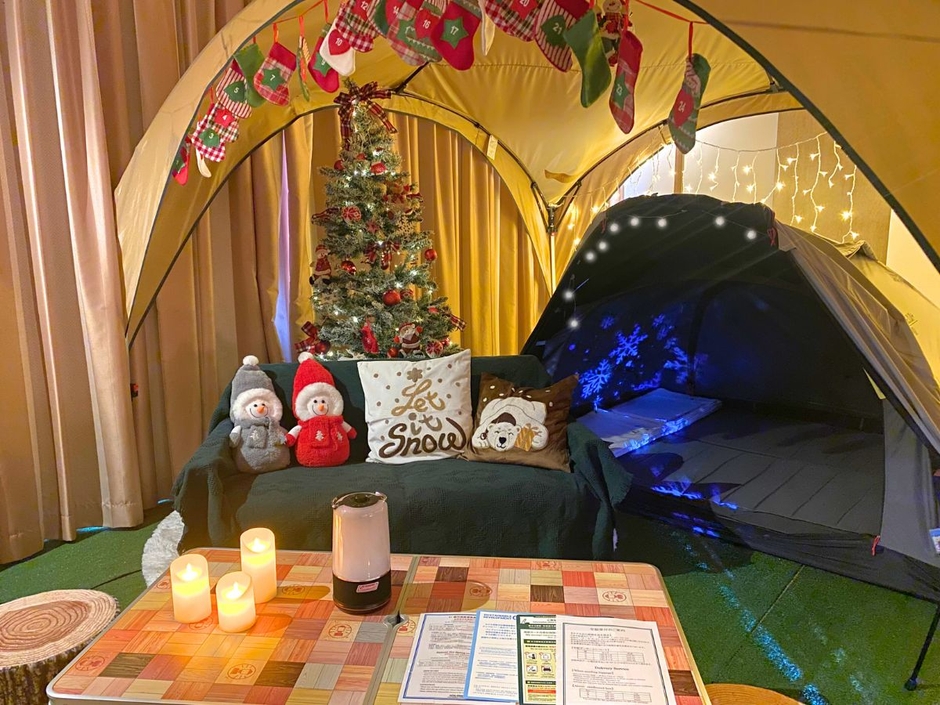 高さ約2ⅿのクリスマスツリーと、20体以上のスノーマンたちが客室を楽しい空間に演出。常設しているプロジェクターを使って鑑賞会をしたり、さまざまな楽しみ方でお過ごしいただけるお部屋。テントやシェードが設置されたグランピングルーム。クリスマスを楽しみながら、キャンプ気分でお過ごしいただけます。