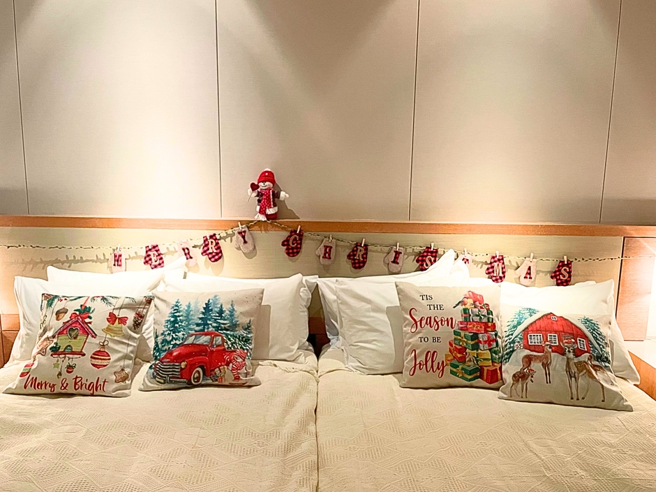 クリスマスルームは、3つのテーマに合わせた装飾を施しました。①タワーグランデスーペリアルーム。「クリスマスのおもちゃ工場」をテーマに高さ約2ⅿのクリスマスツリーをはじめバルーンやタペストリーなど華やかに装飾した、楽しく遊び心あふれる客室です。装飾しているバルーンはご滞在の記念にお持ち帰りいただけます。②デラックスダブルルーム。「クリスマスホリデーは大切な人と」。室内にはクリスマスツリーと大きなテディベアを配置。またキャンドル暖炉をつくり暖かみのある装飾で、大切な人とゆったりとした時間をお過ごしいただけます。③1室限定のグランピングルーム。「サンタクロースと暮らすスノーマンたち」。室内でキャンプ気分を楽しめる人気の客室をクリスマス仕様にいたしました。20種類以上のスノーマンを飾り、キャンプ気分に浸りながら部屋のあちこちにいるスノーマンたちを探したり、常設のプロジェクターで鑑賞会も行えます。