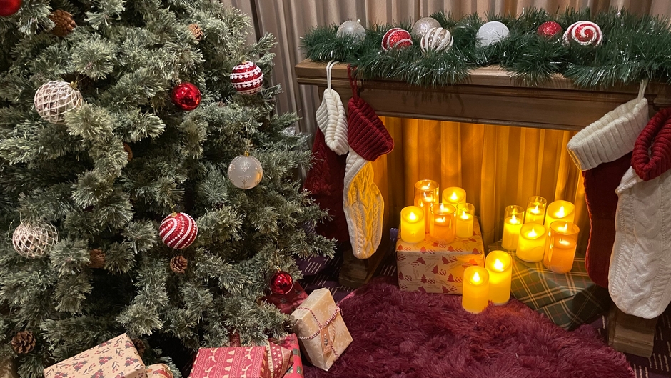 高さ約2ⅿのクリスマスツリーとキャンドル暖炉。大きなテディベアと一緒に暖かみあふれるお部屋でゆったりとした時間をお過ごしいただけます。