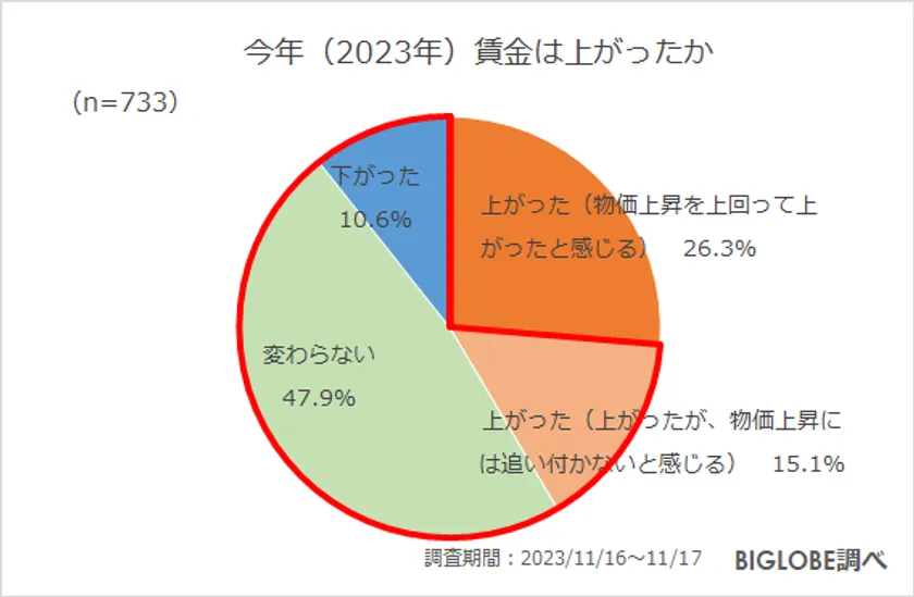一方、「上がった(上がったが、物価上昇には追い付かないと感じる)」(15.1%)、「変わらない」(47.9%)、「下がった」(10.6%)と回答した人をあわせ、「物価上昇を上回る賃金の増加はなかった」という人は7割強だった。