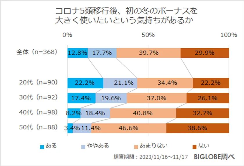 全国の20代から50代の男女1,000人のうち「冬のボーナスが出る予定」という368人に「コロナ5類移行後、初の冬のボーナスを大きく使いたいという気持ちがあるか」を質問すると、「ある」(12.8%)、「ややある」(17.7%)をあわせ、「大きく使いたい気持ちがある」という人は3割という結果に。