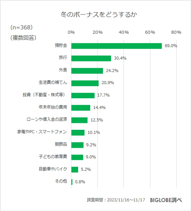 さらに、「冬のボーナスをどうするか」については、「預貯金」(69%)が7割と最も多かった。「預貯金」以外では、「旅行」が30.4%と旅行への意欲がうかがえる結果に。次いで「外食」(24.2%)となった。