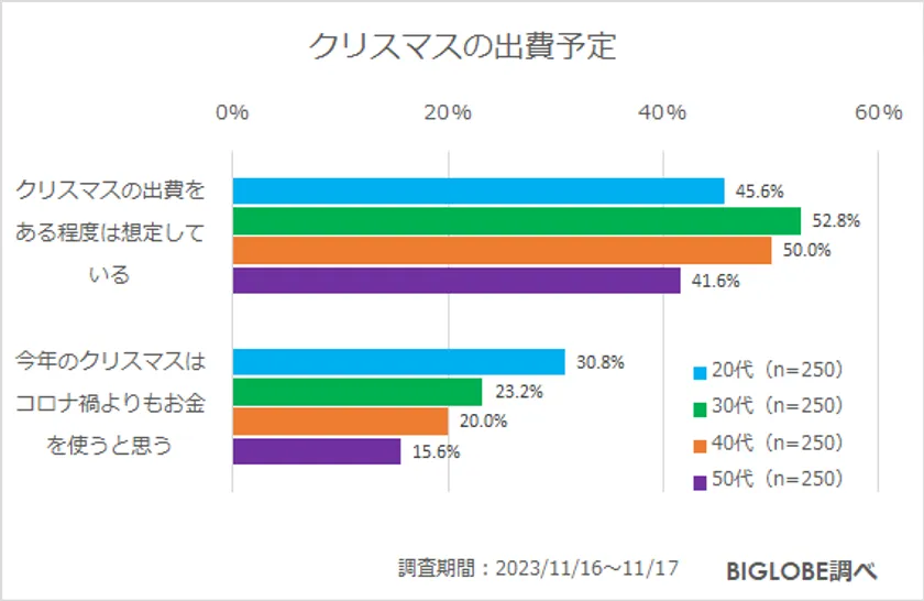 さらに、「今年(2023年)のクリスマスはコロナ禍よりもお金を使うと思う」については、20代(30.8%)、30代(23.2%)、40代(20%)、50代(15.6%)と若い世代ほどコロナ禍よりも出費を予定していることが明らかとなった。