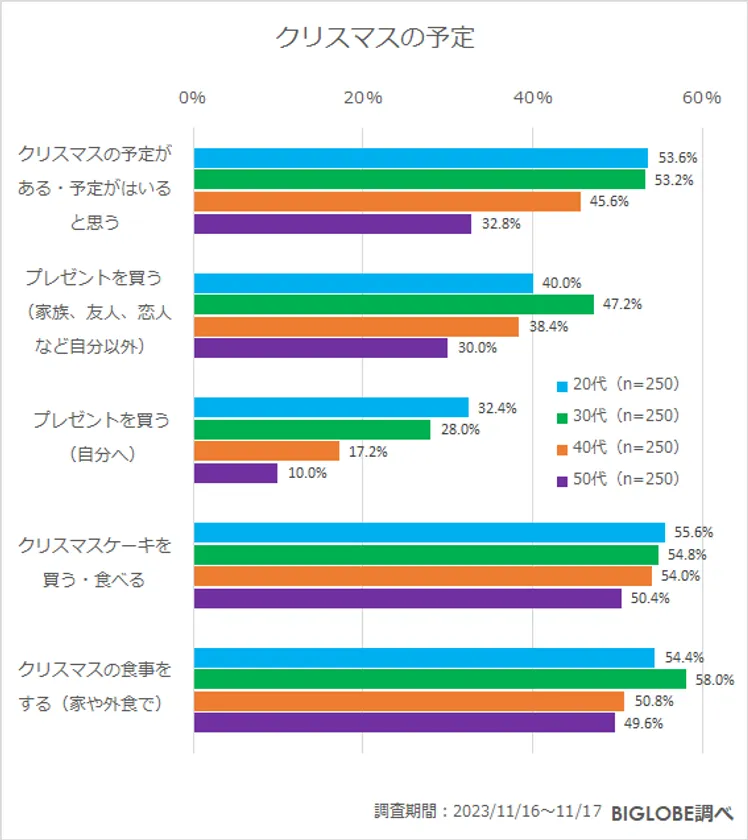 また、「クリスマスの予定」について複数の質問をすると、「クリスマスの予定がある・予定がはいると思う」と回答した人は20代、30代は5割強に。「プレゼントを買う(自分へ)」については、20代、30代が3割前後と、若い世代ほど自分へのプレゼントを買う予定であることが明らかに。クリスマスケーキ、クリスマスの食事については幅広い年代で5割が予定をしている結果となった。