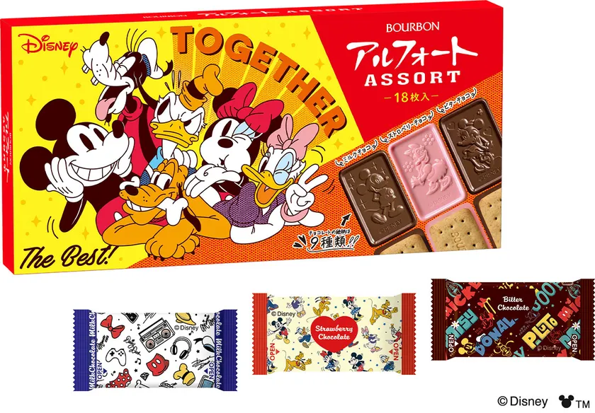 「ディズニー/アルフォート」は、“アルフォート”とエンターテインメント性を組み合わせた商品です。全粒粉入りのビスケットとチョコレートを組み合わせました。ミルクチョコ、ストロベリーチョコ、ビターチョコの3種類をそれぞれ6枚ずつ、全18枚を詰め合わせました。また、チョコレートにはディズニーキャラクターをそれぞれデザインしており絵柄は全部で9種類あります。どのキャラクターが入っているのかは開けてからのお楽しみです。