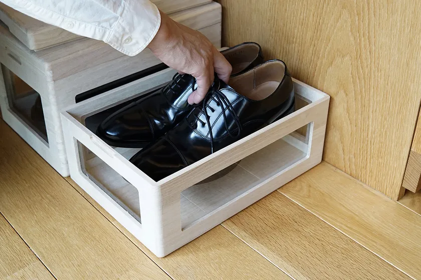 フタを開けなくても中がみえる「桐製くつ箱」 1月16日まで先行予約販売をMakuakeにて実施