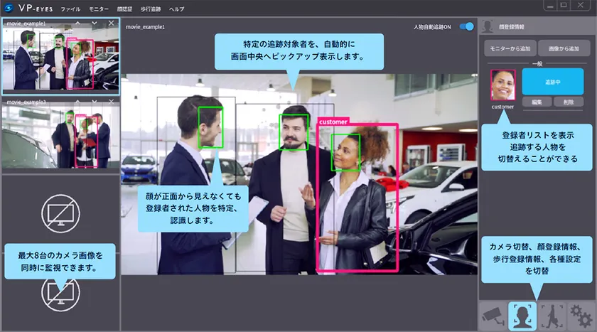 「VP-Eyes」は、AIが人物の顔情報や全身情報を複合的に識別し、顔が完全に映っていない場合でも同一人物と認識するので、登録後の自動追跡が可能です。
