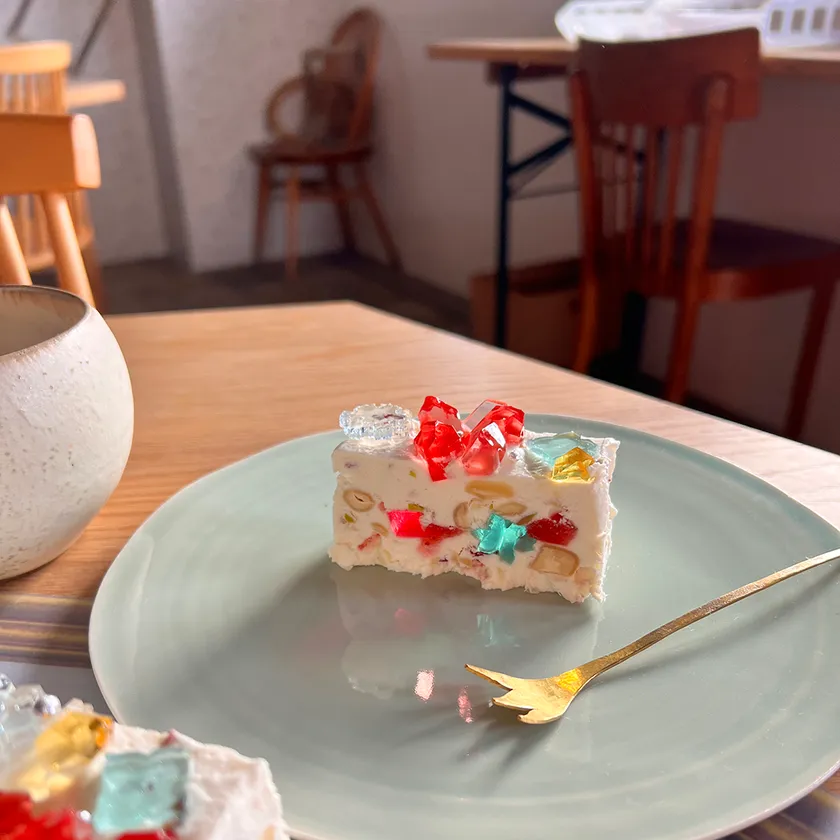 リコッタチーズをふんだんに使用したクリームにナッツやチョコレート、ベリーやオレンジピールなどをくわえたイタリアのシチリア発祥のデザートであるカッサータに、琥珀糖「こうぶつヲカシ」を組み合わせた新感覚スイーツが「宝石のカッサータ」です。