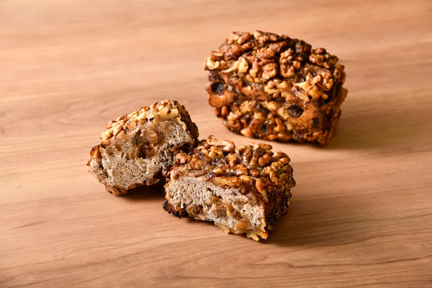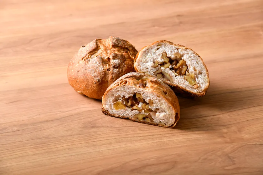 ほんのり甘みのある生地に、カリフォルニア産くるみを混ぜ込み、石窯で香ばしく焼き上げました。風味豊かな自家製発酵種の生地に、三温糖を効かせて味わい深く。噛みしめるほどに大粒のくるみの存在感が感じられ、旨味と香ばしさが広がります。