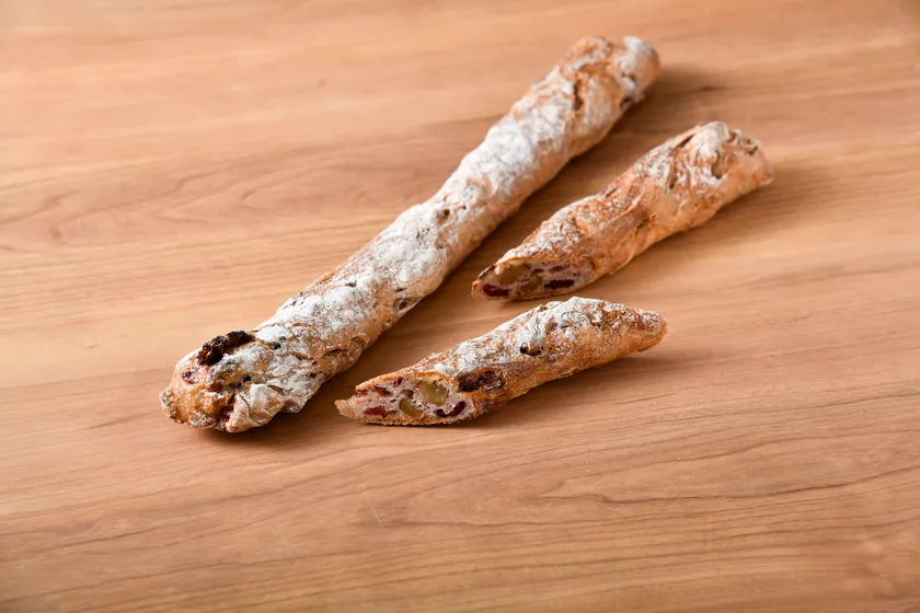 そのモノは入っていないのに、成分の組み合わせによるそのモノの香りがする味わいのパンを作ることです。赤ワインを連想させる組み合わせになっております。そこに香りに負けないようにライ麦をメインに使い、少しの酸味をサワー種で、そして他にないのが周りにつけたくるみにスパイス、レモンゼストをまとわせ、樽の中で熟成させた感じを出しています。