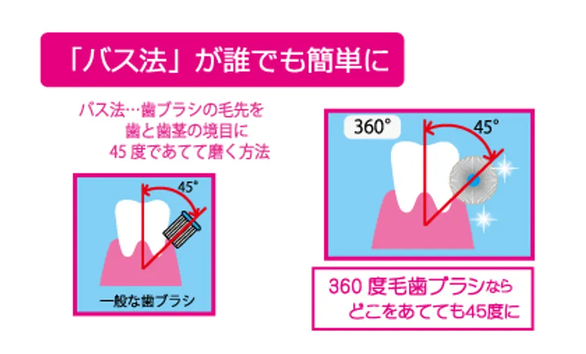 (2) 360度毛があることでブラシの角度を気にせず誰でも簡単に「バス法」が実践できる。方向性がないから持ち替えなくていい。