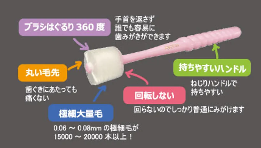 360度毛歯ブラシは、誰にでも簡単・安全・効果的に口腔ケアができる高性能な製品として、老若男女問わず「虫歯、歯周病予防」に効果的な歯ブラシと言えます。