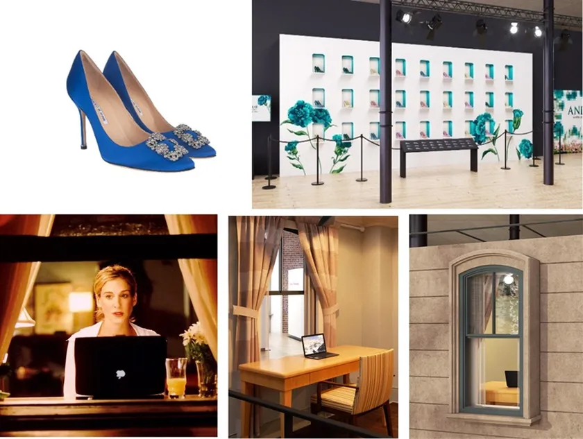 会場にはキャリーがコラムを執筆していた窓辺のデスク「Carrie’s Window (キャリーズ・ウィンドウ)」に座って記念写真を撮ることができるフォト・スポットが登場します。また、キャリーが愛してやまないファッションアイテムとして登場するMANOLO BLAHNIK(マノロ ブラニク)などのハイヒールがディスプレイされた「Wall of Heels(ウォール・オブ・ヒールズ)」には、キャリーのシュークロゼットさながらに、劇中で使用されたものと同じモデルの美しいヒールたちが多数並びます。その他、劇場版1作目でビッグからキャリーへのプロポーズのシーンに登場し有名になったロイヤルブルー・ヒール(MANOLO BLAHNIK(マノロ ブラニク) HANGISI SATIN)も展示予定です。