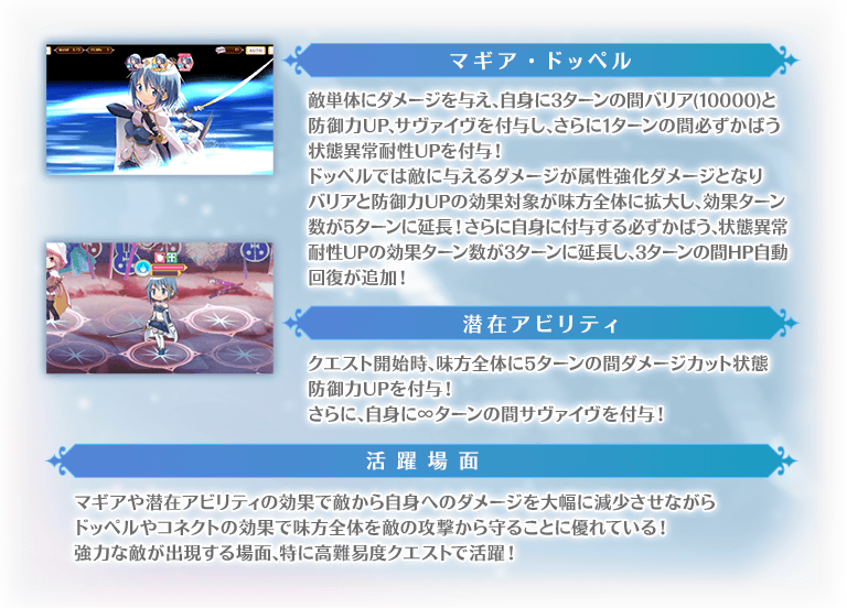 本ガチャより、新魔法少女「美樹さやか scene0 ver.(CV.喜多村英梨)」と新メモリア「分け合う調べ」「旋律に導かれて」が期間限定で登場いたします。