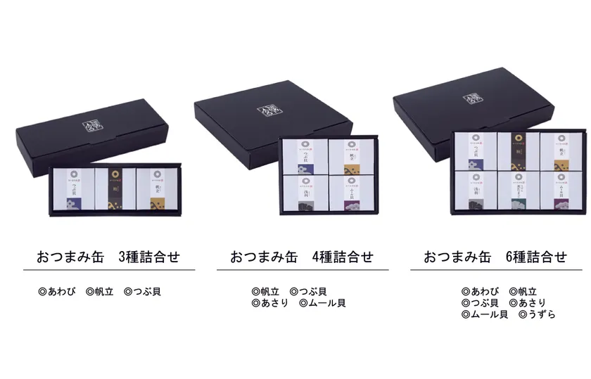 煮貝をより手軽に楽しめる商品として、おつまみ缶(煮貝[缶])も発売します。本商品も作りたての風味と素材の旨味を保持する缶詰製品で、素材は、あわびをはじめ、帆立、つぶ貝、あさり、ムール貝、うずらのたまごの6種類。