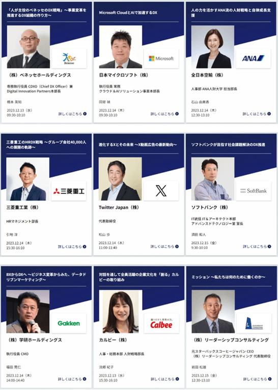 また併催セミナーでは、Twitter Japan、日本マイクロソフト、ソフトバンク、ANA、カルビーなど業界トップ企業の役員などが連日登壇。DX化、働き方改革、経営課題解決の最新事例を学べます。