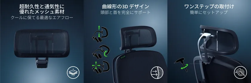 Razer Fujinと同様に通気性に優れた滑らかなメッシュ素材を使用したヘッドレストは、通気性に優れ、一日中涼しく快適に過ごすことができます。