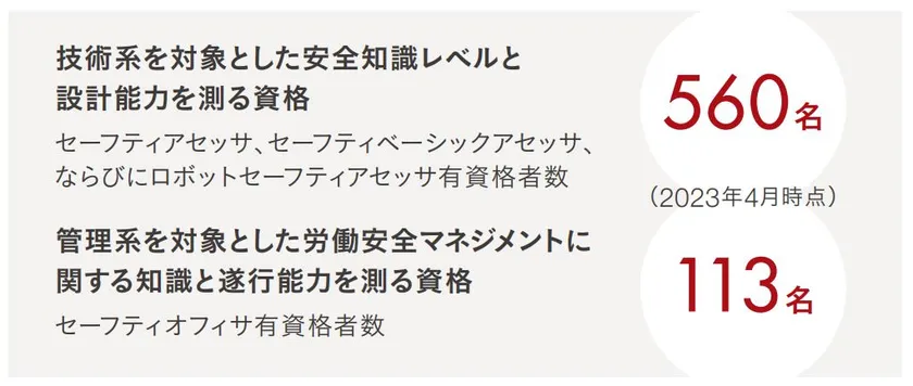 人材面では、全社員へ安全教育を実施するとともに、セーフティーアセッサ、セーフティーオフィサ資格等の安全資格取得を奨励しており、安全・安心を社会に提案できる人材の育成を図っております。