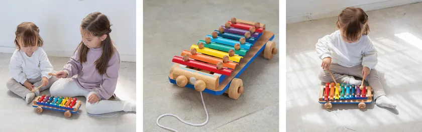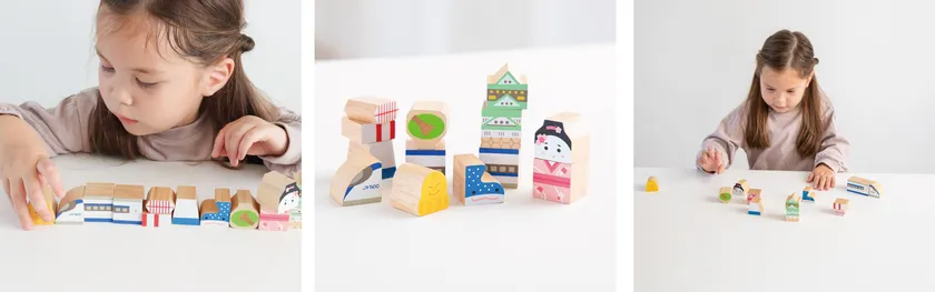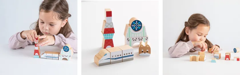 音が鳴るデザインつみきセット、木琴としてもあそぶことができるシロフォンカー、4種のご当地ブロック、型はめパズル、の全7種類の知育玩具は、「触る」「はめる」「音を鳴らす」「引っ張る」「組み立てる」等、五感をつかうあそびを通して、感受性や想像力、思考力、コミュニケーション力を養うことができます。手指や思考の発達に見合った遊び方のデザインや、子どもの好奇心を惹きつける色づかいも特徴です。